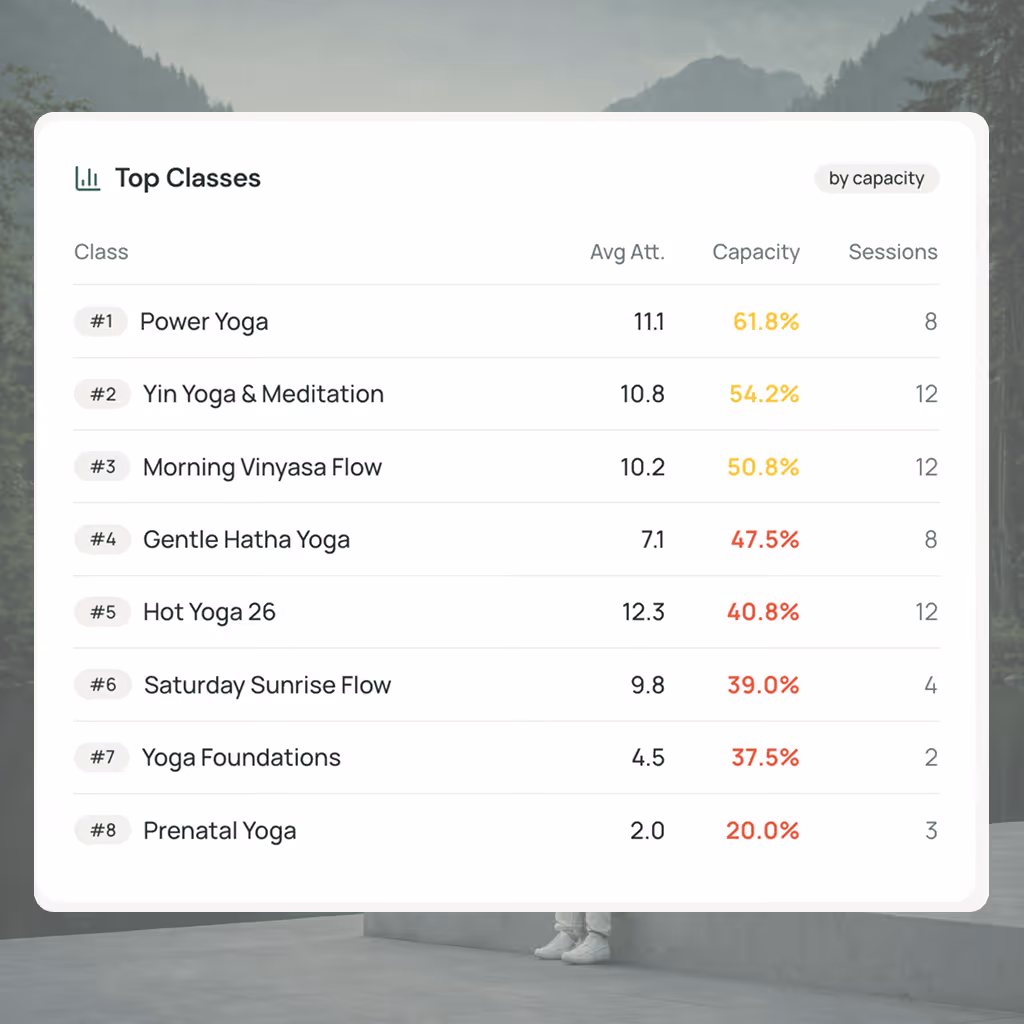 A sortable table showing each service's bookings, revenue, hours, revenue per hour, and margin percentage. Revenue per hour is color-coded so your winners and losers are obvious at a glance. Stop spending time on services that don't pay. Double down on the ones that do.