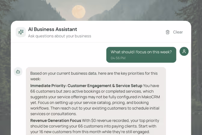 Mako is an all-in-one business management platform built for service-based businesses. It combines CRM, scheduling, payments, team management, AI tools, and financial reporting into a single app — so you don’t need to stitch together five different tools to run your business.