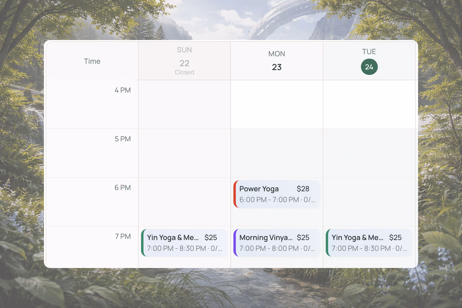 Create individual occurrences — "Vinyasa Flow, Monday Feb 10 at 9am." Each instance tracks its own status (scheduled, completed, cancelled) and actual attendee count. See at a glance which classes are filling up and which need a boost.