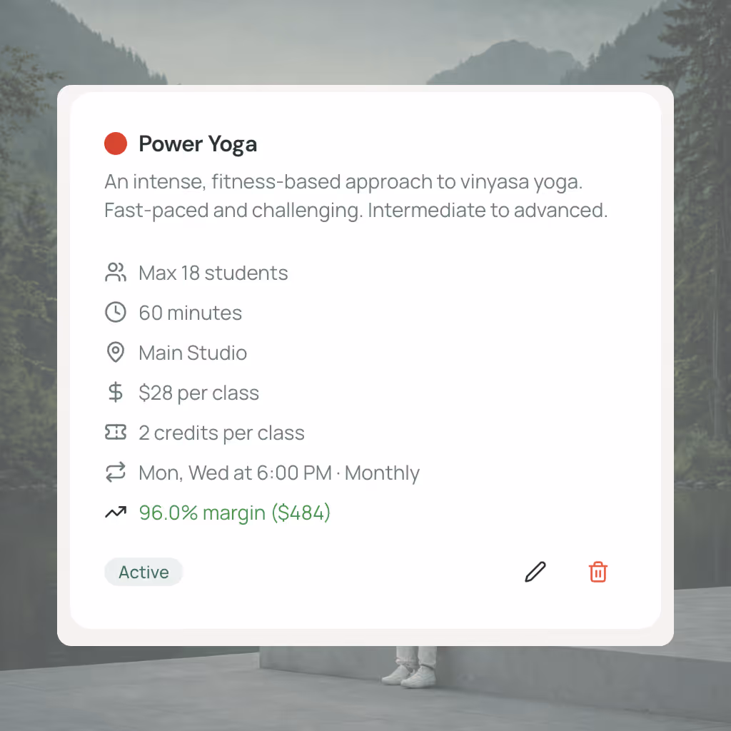 Create classes with name, description, location, duration, capacity, drop-in price, and credits required. Set a color for easy calendar identification. Toggle active or inactive as your schedule changes.