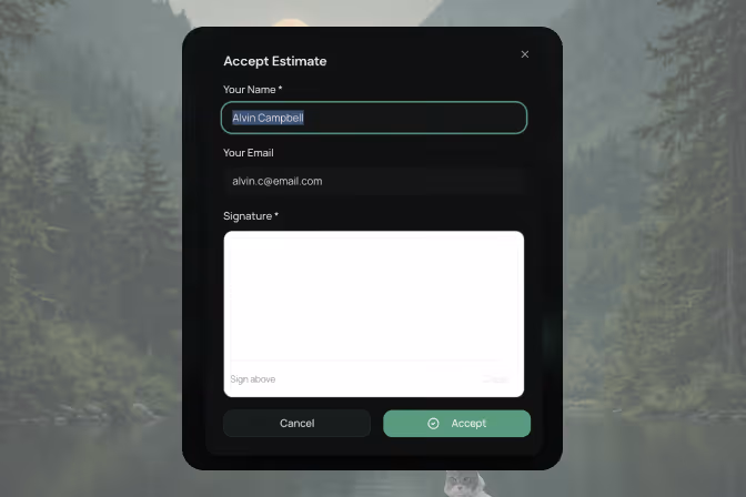 They receive a link to view the estimate on any device. To accept, they enter their name, email, preferred dates, and draw a signature. Signatures are saved with timestamps.